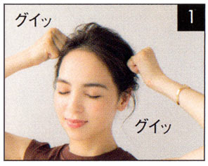 手を握って“グー”にし、第二関節でグッグッと頭皮を押していく。耳の外周を親指&人差し指で挟んで刺激するのも◎。