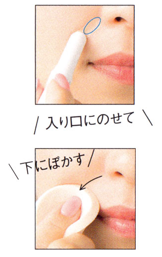 溝が一番深い鼻の下の入り口の部分に短くコンシーラーをのせ、それをスポンジで線にそってぼかす。全体にのせるとかえって目立つので×。