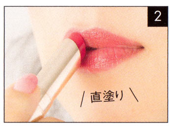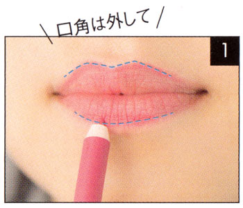 リップカラーになじむ色のペンシルで、唇の山、底の輪郭を縁取る。全体を囲むと不自然なので、口角ははずして。