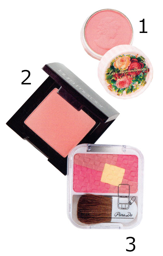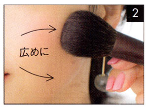 ブラシにピンクのチークを取って手の甲で色を調節し、朝のせた範囲よりひと回り広く、薄くふんわりとのせる。濃くつかない色を選ぶのもコツ。
