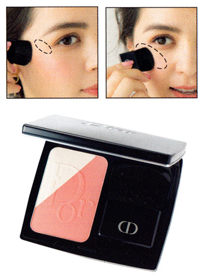 チークは斜め上がりの楕円形にオン。頬骨の高い位置にのせたハイライトでも斜め上がりの光の筋を作ることで、よりリフトアップ印象に!