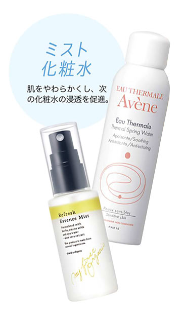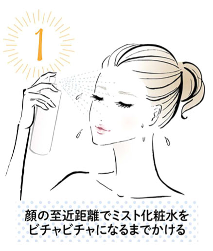洗顔直後の肌をやわらかくほぐすため、プレ化粧水とししてミスト化粧水を肌にたっぷりかける。顔から水がした。たるくらい、顔に5~6周まわしかけて