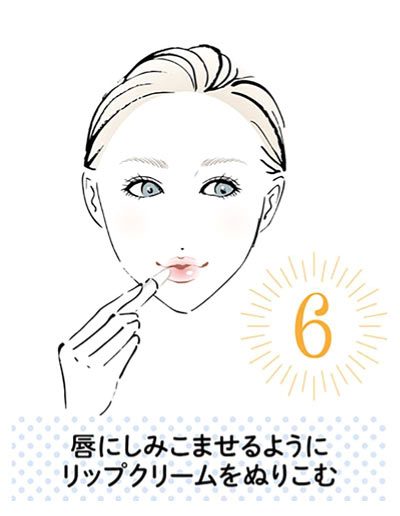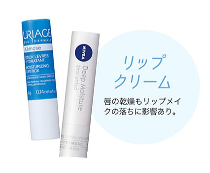 リップクリームは、唇に浸透させるようにぬりこむこと。ちょこっとぬりをくり返すより、じっくりぬりこんでおくと長時間潤いが保たれ、リップメイクの下地にもなる。