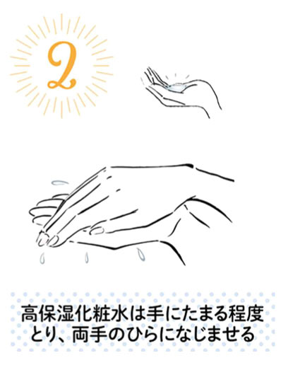肌がビチャビチャの状態のまま、今度は手のひらに適量この2倍以上の高保湿化粧水を出す。その上にもう片方の。手のひらを重ね、両手にまんべんなくなじませて。