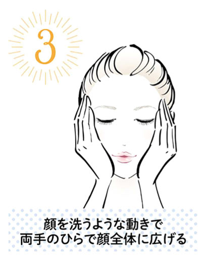 高保湿化粧水で顔を洗うようなイメージで、両手のひらの全面を使って顔全体になじませる。片手や指先ではつきムラができやすいので、必ず両手で行うのがポイント。