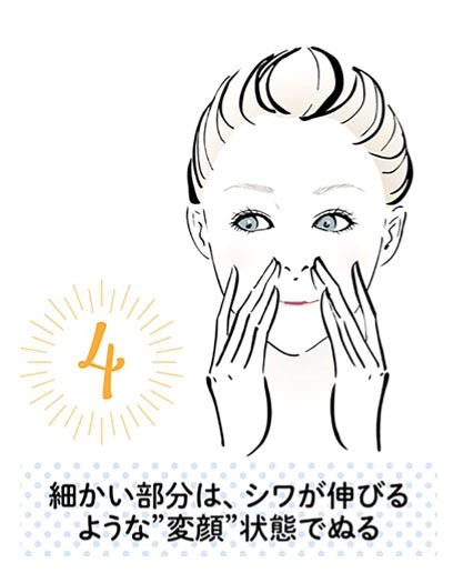 小ジワが出やすい目の下や口角、鼻の下や小鼻まわりなどは、シワが伸びるような表情をつくり、指の腹でしっかりぬりこむ。目の下は、指を左右に動かすようにぬって。