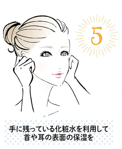 年中むきだしの首や耳は、エアコンや紫外線で乾燥しやすい部位。顔になじませたそのままの手で、首全体と耳この上部や裏側などのケアを。これだけでも十分保湿される。