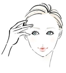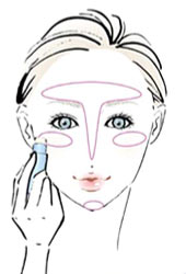 皮脂分泌の多い眉間、小鼻まわり、唇下のくぼみなど、毛穴の開きが目立ちやすい部分に、毛穴ケア用下地をぬりこむ。細かい円を描くようにすると毛穴が目立ちにくく。