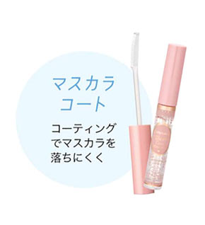 カールキープ力の高いマスカラをまつげの根元からつける。そのあと、マスカラ落ちを防ぐために、クリアタイプのマスカラコートでまつげ1本1本をコーティング。