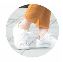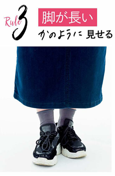 ボトムの裾から見える脚の肌の分量が多いと、下半身がそこで途切れて脚が短く見えがち。靴と同系色のソックスを使って色のつなぎを長くするとあら不思議、脚長に見える!