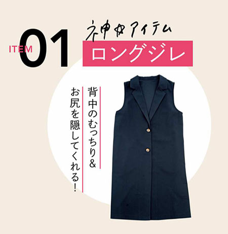 気になるウエストやお尻の横幅は、ロングジレなどアウターの縦ラインを使って、見える分量をカット! 横幅が体の厚みを強調するので、このテクでウエストの太さが目立たなくなる。