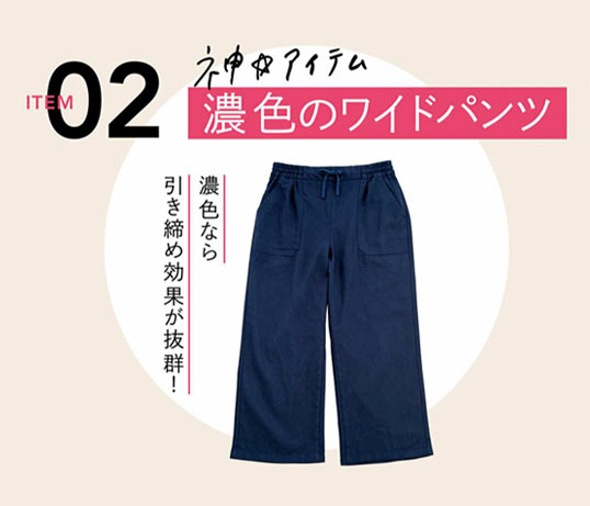 ウエスト位置がはっきりすると、そこまでが脚、という見た目のガイドに。ハイウエスト気味にすることで、あたかも脚長な人に変身!