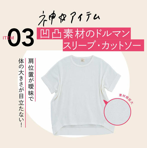 アームホールの切り替えがないと、肩の位置があいまいに。肩まわりにゆとりのあるドルマンスリーブは、体との間に空気を含んで肉感を隠す!