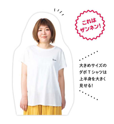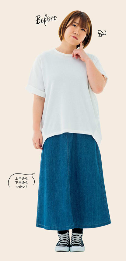 はやりのゆるシルエットのアイテムは、ただ着るだけではメリハリがなく、のっぺりした印象。布の分量が多いので、体も大きく見えてしまいがち。