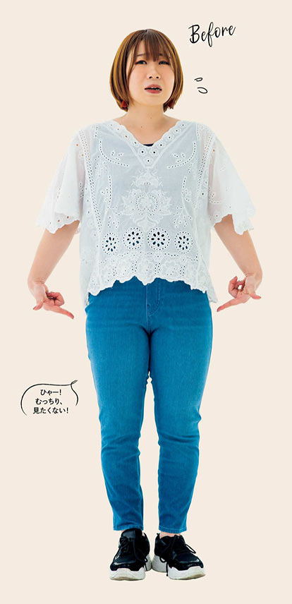 ローライズがはやったけど、細く見せたいなら高めウエストのものを。ウエストにお肉を乗せるより、内側に入れ込んできっちりガードして。