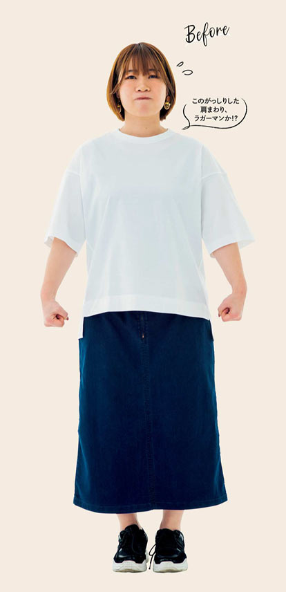 ドロップショルダーは決してきゃしゃには見せてくれないので要注意。落ちた肩位置までがリアル肩に見えてしまい、かえってがっしりイメージに。