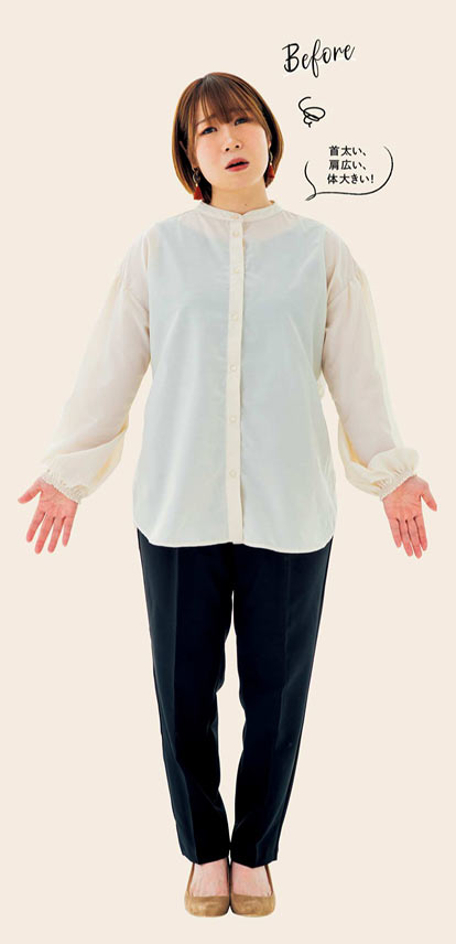 スタンドカラーなど、首の詰まったデザインは首を太く、短く見せるのでNG。首が短いという印象は、体や顔まで大きく見せてしまう(泣)。