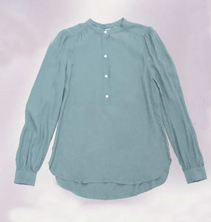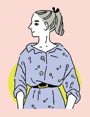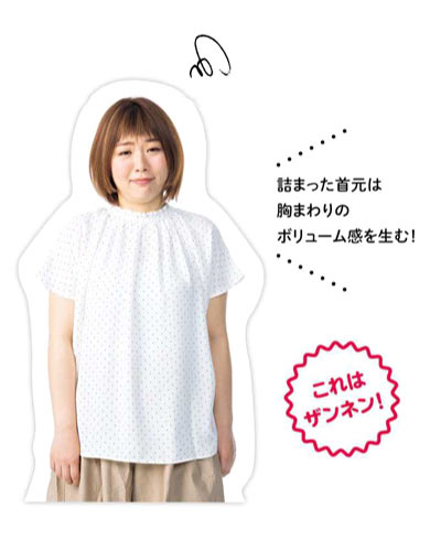 厚みと丸みを帯びた肩まわりのラインが体を太く見せるので、ここが隠しどころ。アームホールの切り替えのないデザインは、空気を含んで広がり、体のラインをあいまいにぼかしてくれる