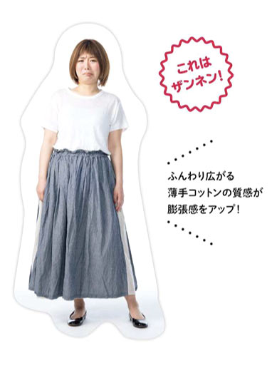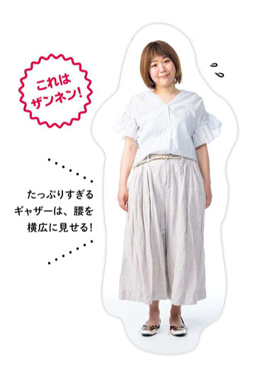 腹肉が隠れるような気がして、ギャザーやタックの入ったものを選びがちでは?でも逆に腰が横に広がって見えて逆効果に。ウエストまわりはシンプルデザインを選んで。