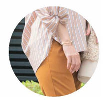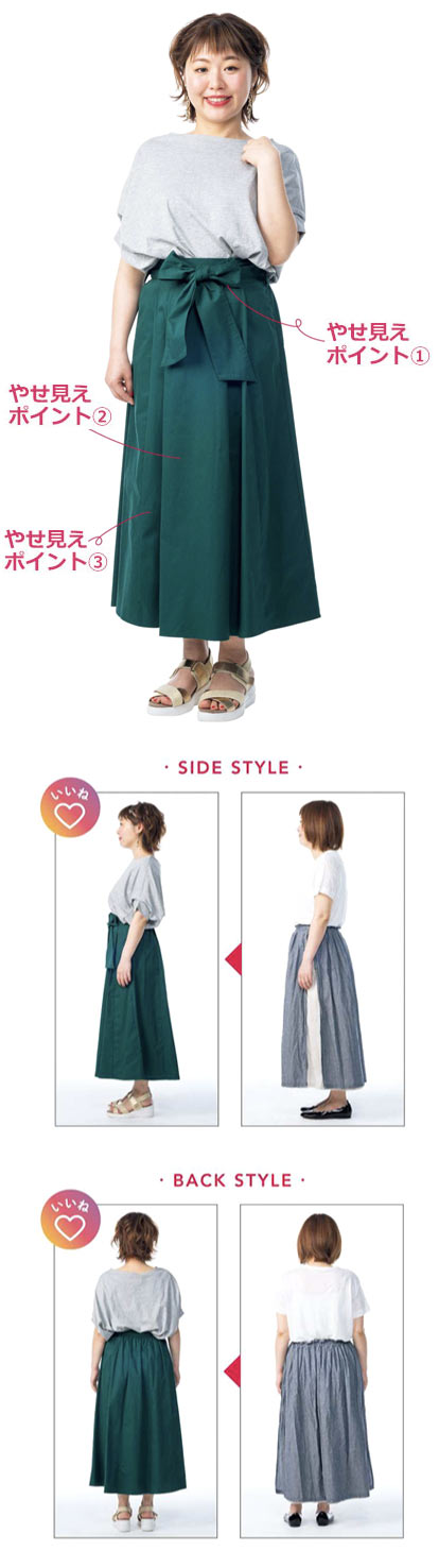 ついウエストを隠したくなりますが、見せてマークしたほうがメリハリがつき細く見えます。厚手の生地のスカートやパンツならカバーも可能!