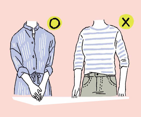 細めで目立ち過ぎないストライブは縦長の効果があり、やせ見えに◎。ただ太すぎるストライプなど派手なものは逆効果も招くので、控えめな色柄を選んで。