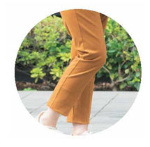 お尻から裾にかけて広がるシルエットが脚のラインをすべてカバー。揺れるパンツの中にあるのは細い脚、と錯覚させる効果あり!