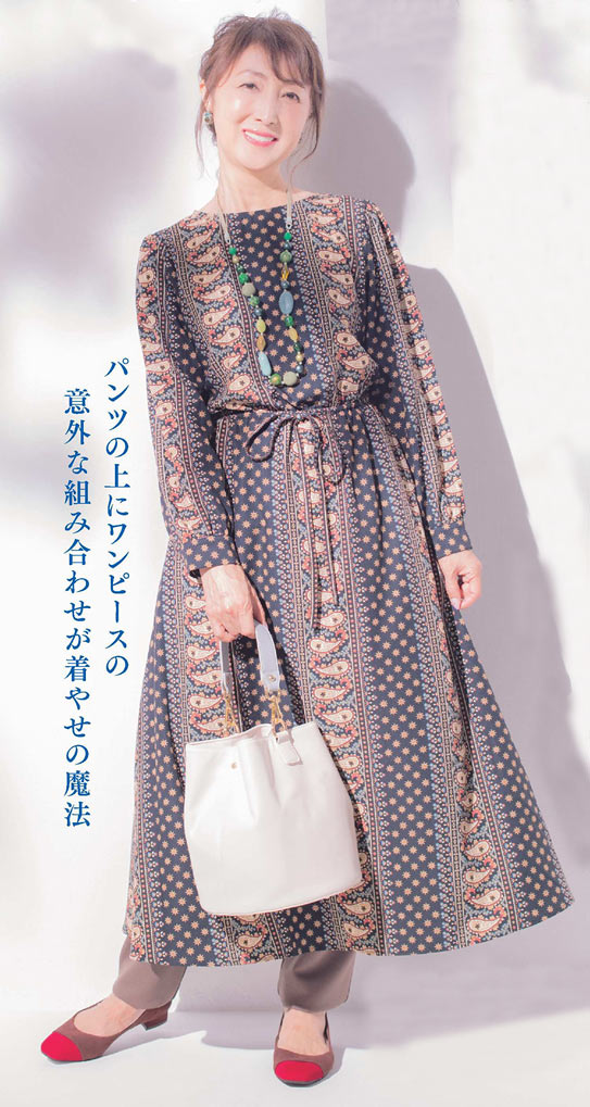 裾が引き締まっている代わりにお尻&太ももにゆとりがある着やせパンツ。あえて上からワンピースを合わせるのが今年の流行であり、おしゃれなさらなる着やせテクなのです!