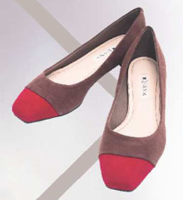 2色使いのパンプスで足元にもアクセントを追加。茶色と赤のコントラストで季節感をリード。