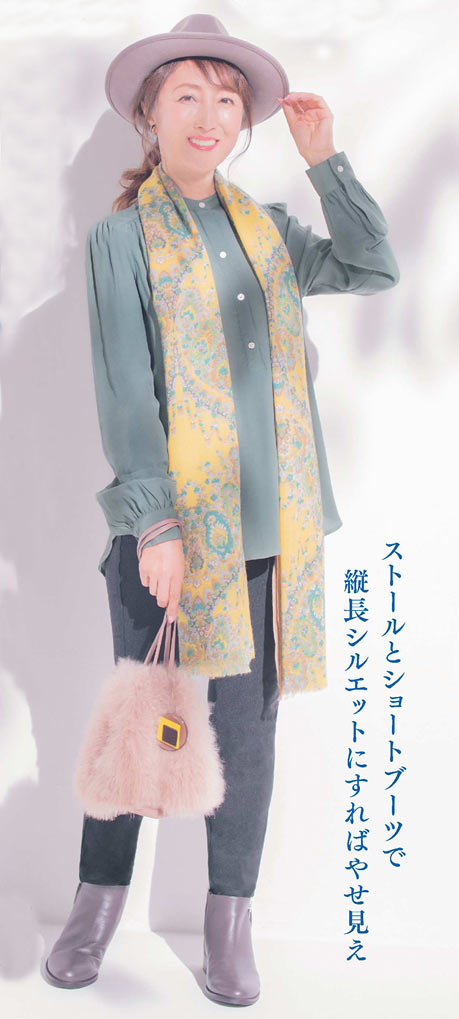 マスタードイエローのストールはアースカラーとの相性が抜群。冬のコーディネートの差し色として活躍します。