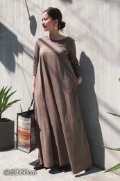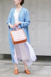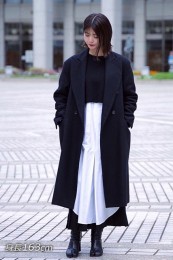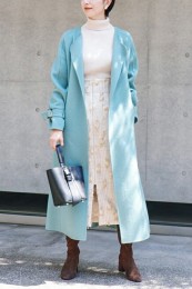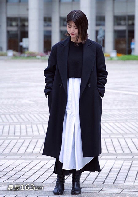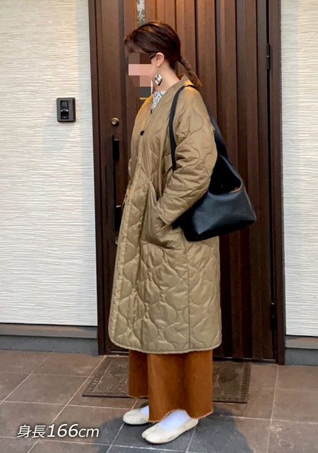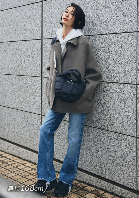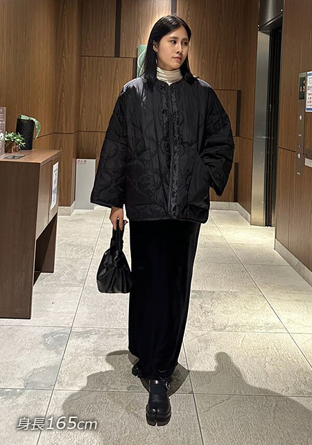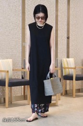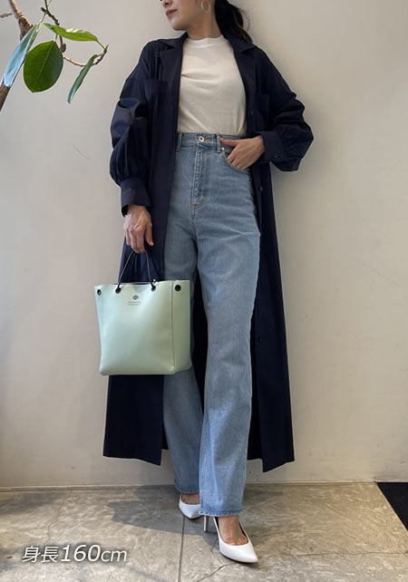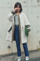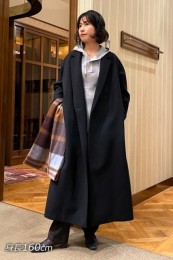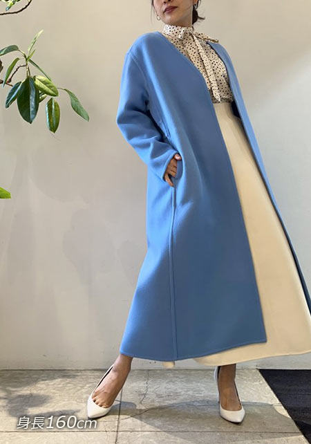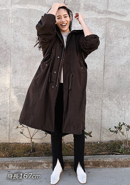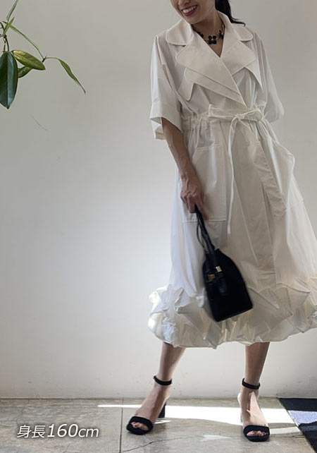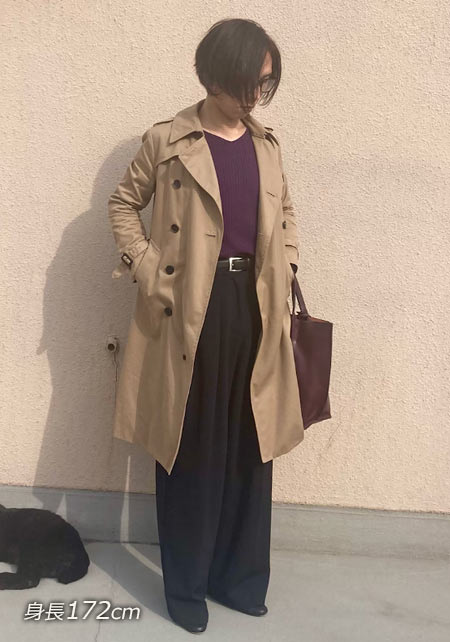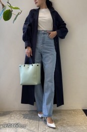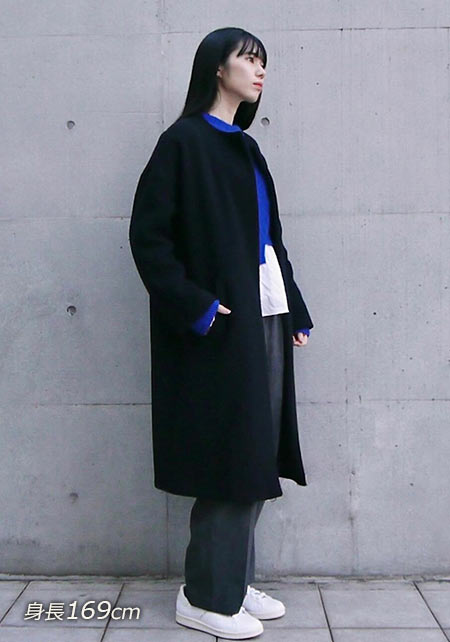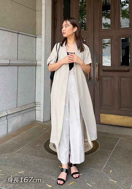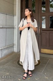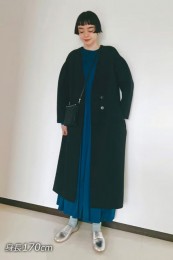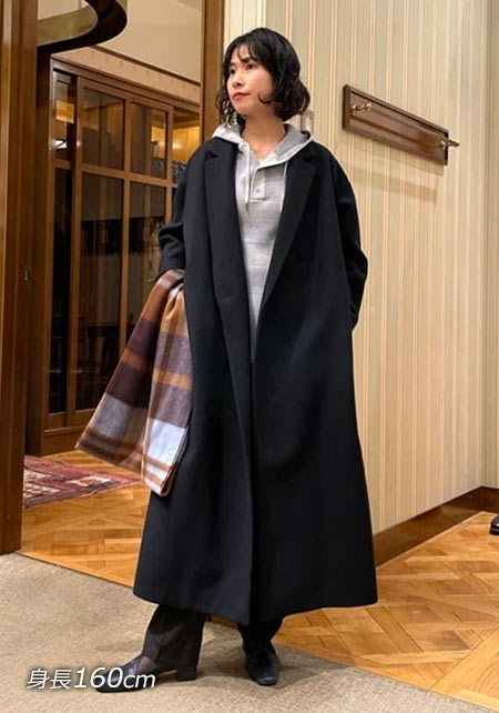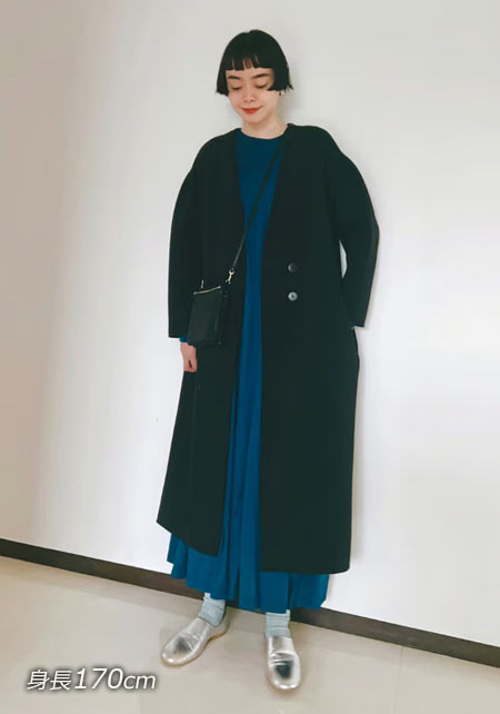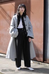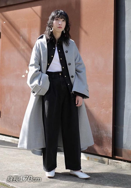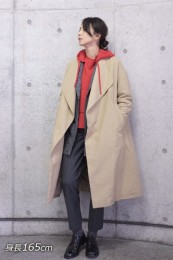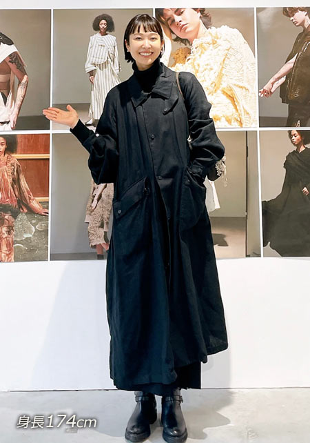 さらっとした風合いとドレープ感のある素材を生かして、ガウンのようにバサッと羽織れるシルエットに仕上げているので、長身の人でもすっきり軽快に着こなせます。モデルさんは163cmでサイズ36を着用。