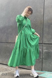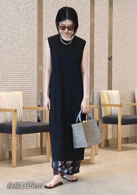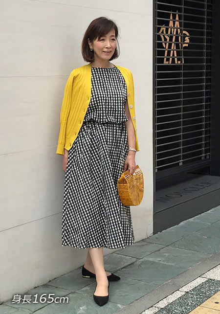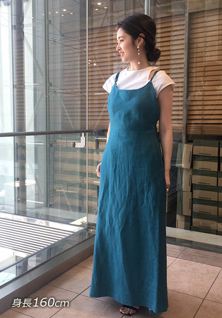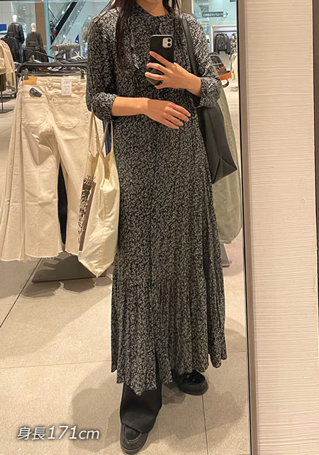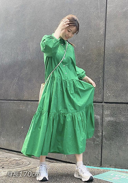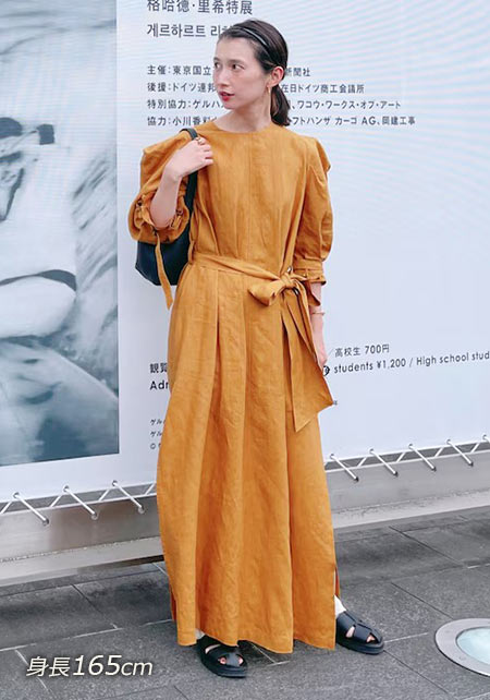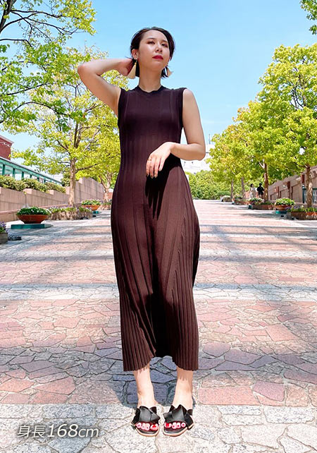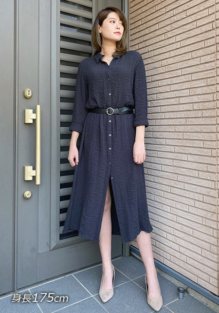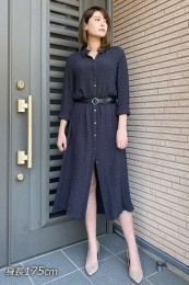 女性らしい印象づくりに欠かせないワンピース。こちらはサイズ38(M)で166cmのモデルさんが着用。もうひとつ上の40(L)サイズなら170cmくらいの方に最適です。
