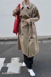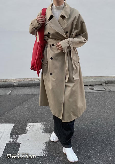 通常のトレンチよりも長い着丈とルーズなサイズ感で製作。