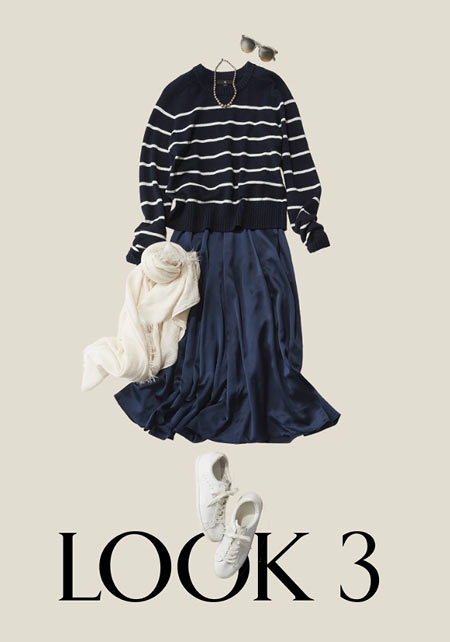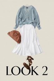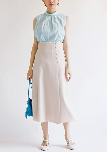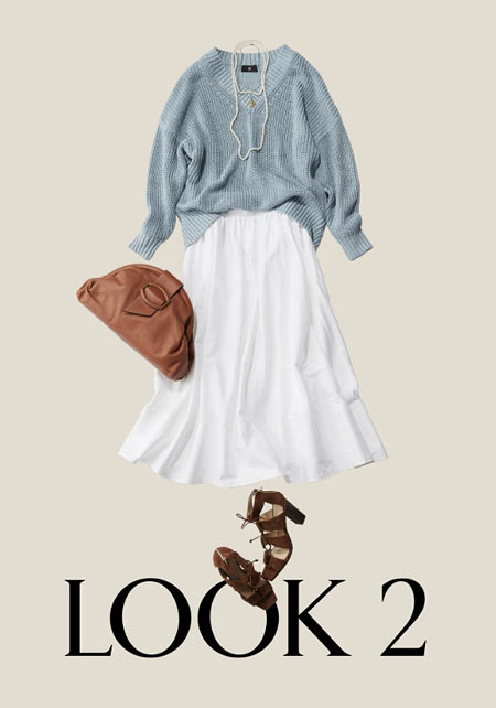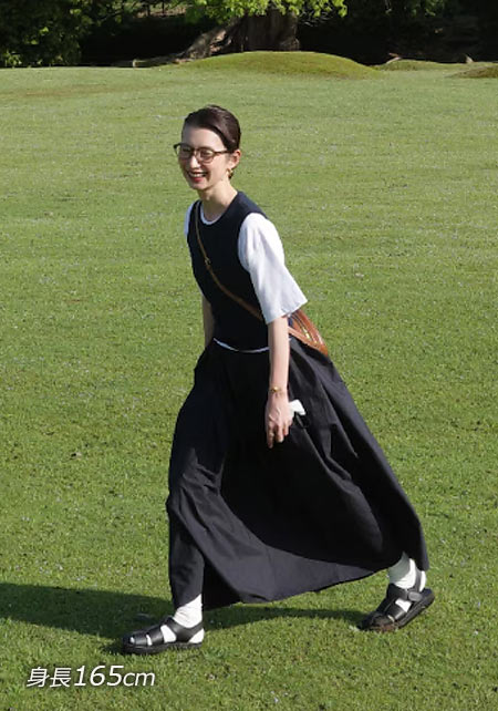 長身の人ほどサマになるロング丈スカート。あえてヒールのあるパンプスやサンダルをもってきてサラリと着流すのが正解。
