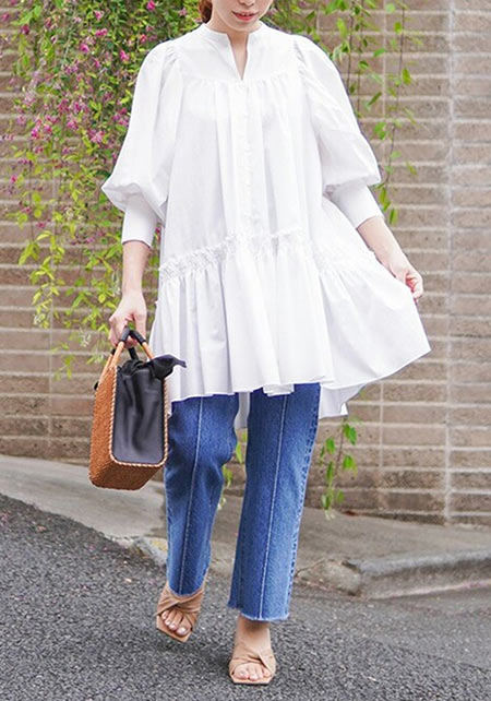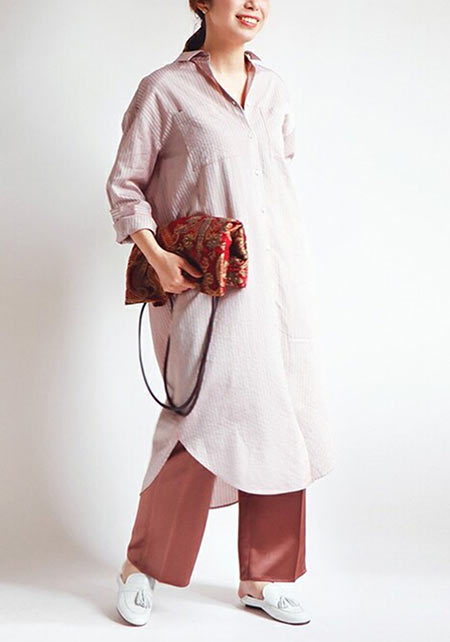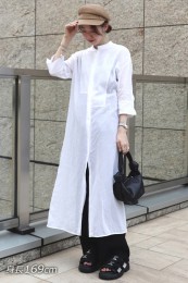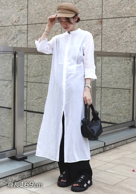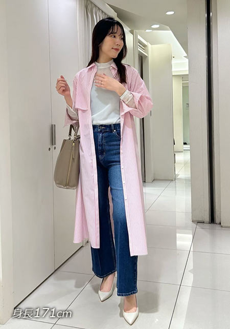 これ一枚で「背が高い女性のきれいめカジュアル」を叶えるロングシャツ。透け感のある軽やかなコットン生地は春らしさを誘いますね。
