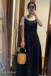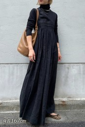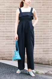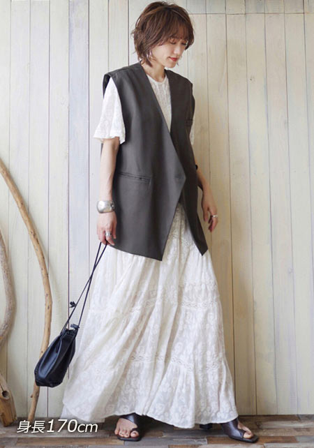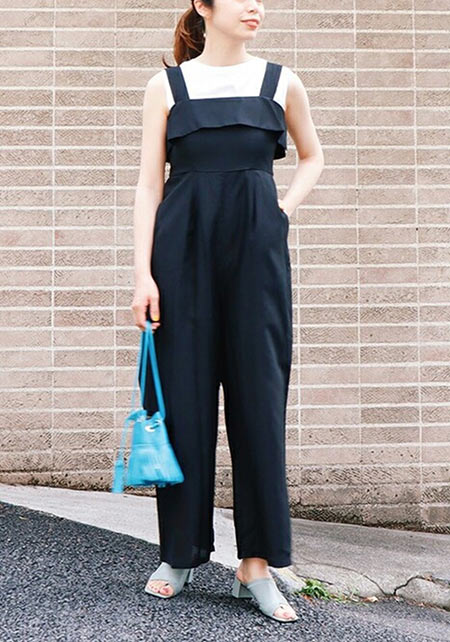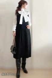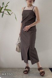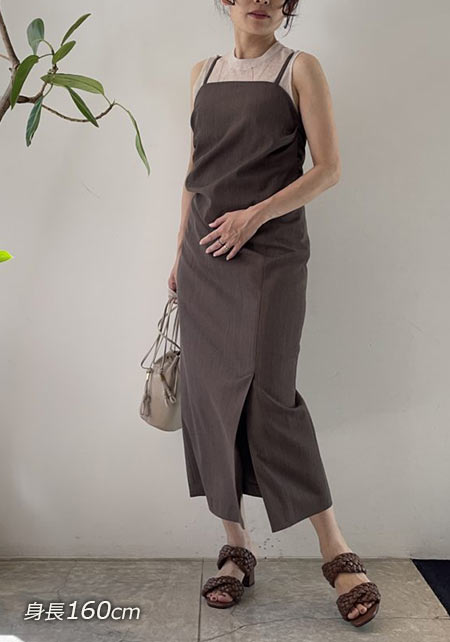 斜めのカッティング×縦長シルエットにより、シックかつシャープに着られるエプロンワンピース。