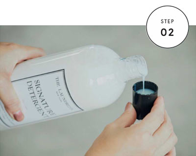 洗剤をキャップに取り洗濯機へ。白物や明るい色、汚れがひどい場合はお湯を使用。