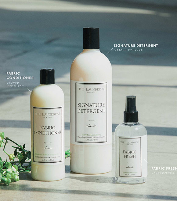 日々の洗濯に。(右から)シグネチャー デタージェント classic 1L \3,500、ファブリックコンディショナー classic 475mL \2,800