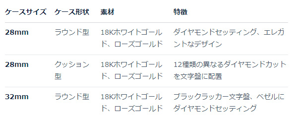 時計というよりジュエリーとしての側面が強調されており、カクテルパーティなど社交の場で身につけることを想定しています。