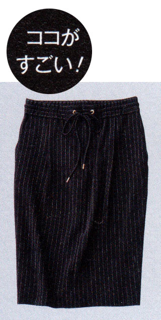 縦のラインが印象的なピンストライプに加え、高めの位置にあしらわれたバックポケットが、ヒップアップ効果を発揮する。縦にすとんと落ちる、とろみのある素材も優秀。まるで美脚パンツを探すように、タイトスカートも探せる時代になったと実感。