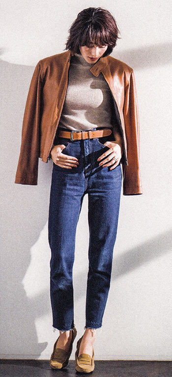 ミニマルなデザインだからこそバランス重視。スッとIラインを際立たせたいからボトムスはハイウエストにインがベストだと思います。レザージャケットは義母から譲り受けたもの。デニムは、ドゥーズィエムクラス。
