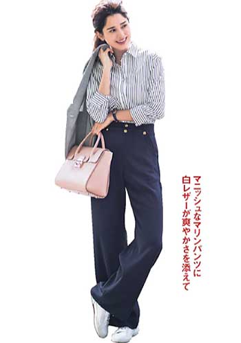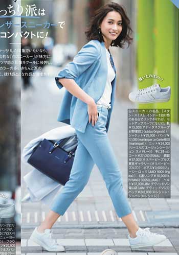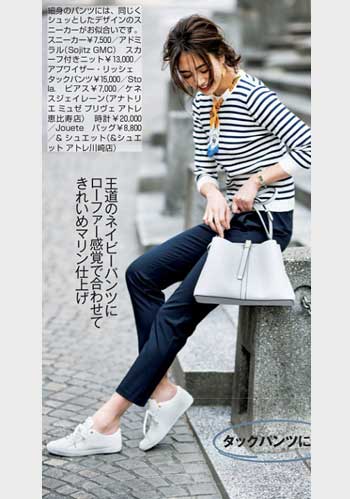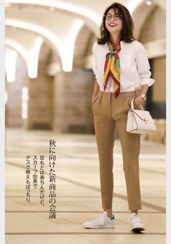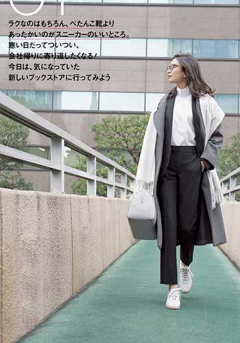 きれいめに着こなせる白スニーカーの名品「スタンスミス」。真っ白な色が真面目な通勤スタイルに、今っぽい抜け感をプラスします。
