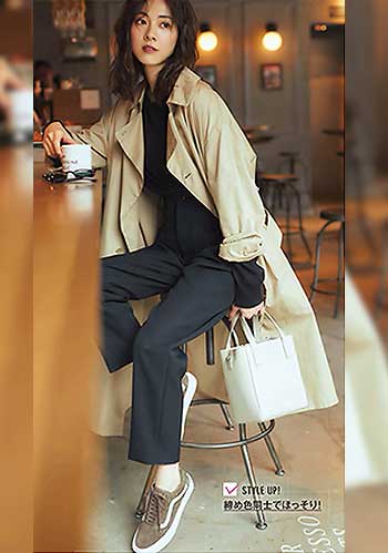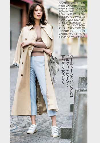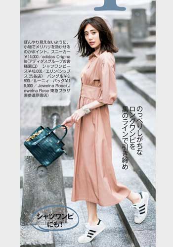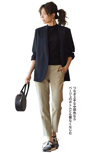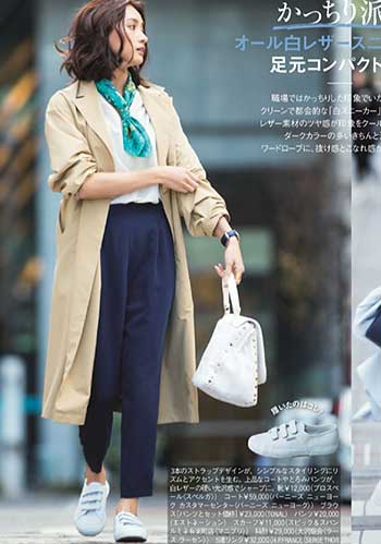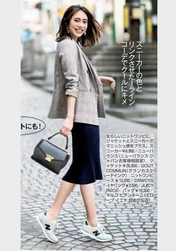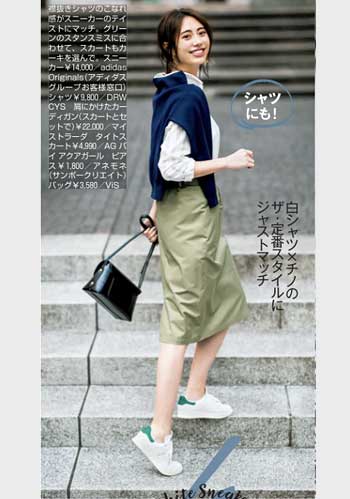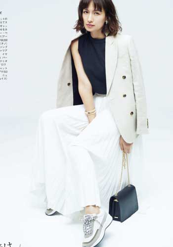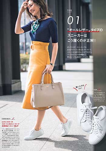 定番の白をもっている人におすすめなのはベージュのスニーカー。フェミニン派が得意なピンクや白でなじませたやわらかな配色のスタイリングにも好相性。