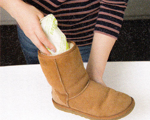 「内側のムートンは風合いを損なうので洗いません。気になる汗やにおいは常に乾燥剤をセットしておくことで対応を。『ほしものびより』(¥648)は抗菌・消臭機能もあって便利。型崩れも防止できます」