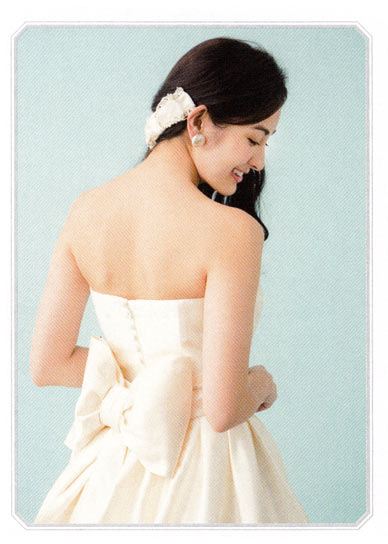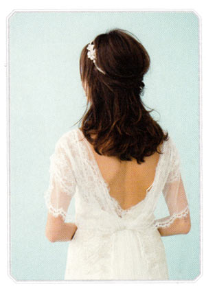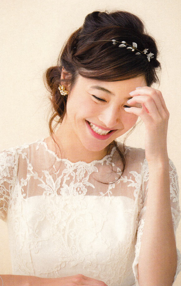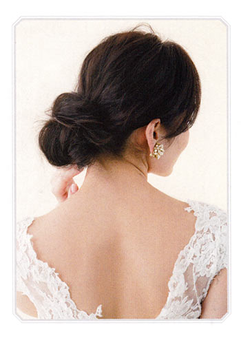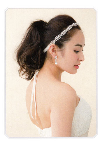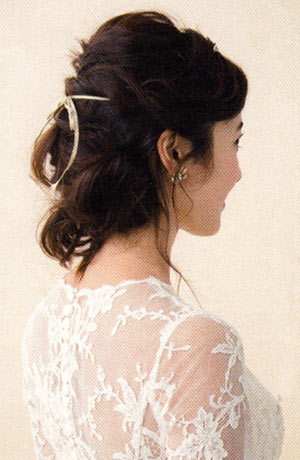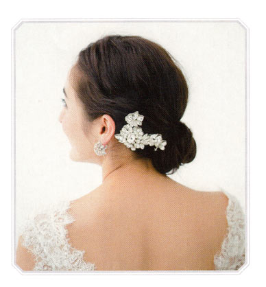 どの角度から見てもきれいに見えるよう、髪を寄せてない側に、大きめのヘッドアクセを。