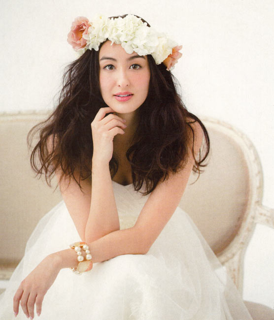 なるべく横にボリュームを出したい面長さん。花冠を選ぶ時のポイントは、サイドにボリュームが出る大きめの花でできたもの。更に、髪もふわふわに巻いて、広がるように整えることが大切です。少し斜めにつけるとバランスが◎に。