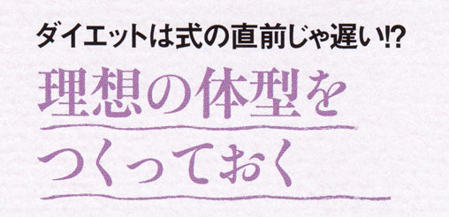 よく結婚式の直前にスパートをかけてダイエット、なんて話も聞きますが、理想は試着の段階である程度体型を整えておくこと。そうすれば直前に慌ててサイズ調整なんてことも防げるし、何より試着の幅が広がります。