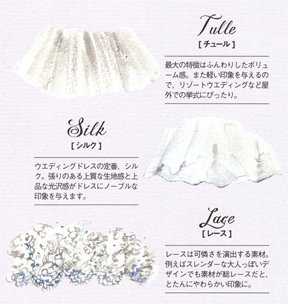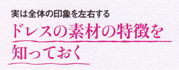 ドレスは使われる素材によって、同じデザインでも印象ががらりと変わるもの。ここでは特によく使われる素材を紹介します。