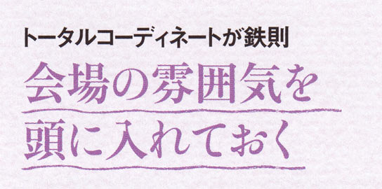 重厚な趣きのバンケットルームに軽いドレスなど、いくらドレスが自分に合っていたとしても会場の雰囲気とちぐはぐだったら魅力は半減。その会場で着ている自分をイメージして試着することを忘れずに。